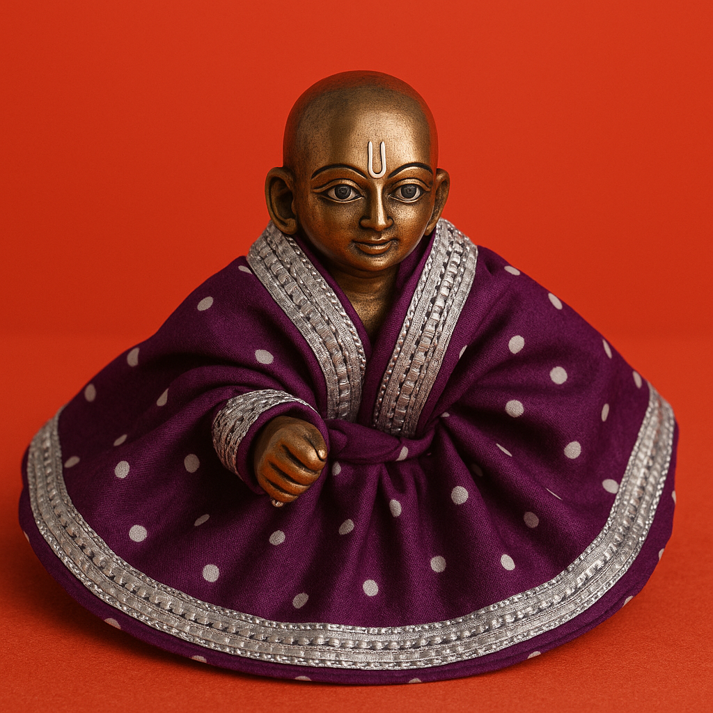 Dress your divine Laddu Gopal in this regal polka-dotted poshak, radiating grace and devotion. Crafted with love, this circular dress perfectly fits small idols, ensuring a blend of tradition and charm. The shimmering border and deep purple hue make it ideal for daily darshan or special festive adornments.